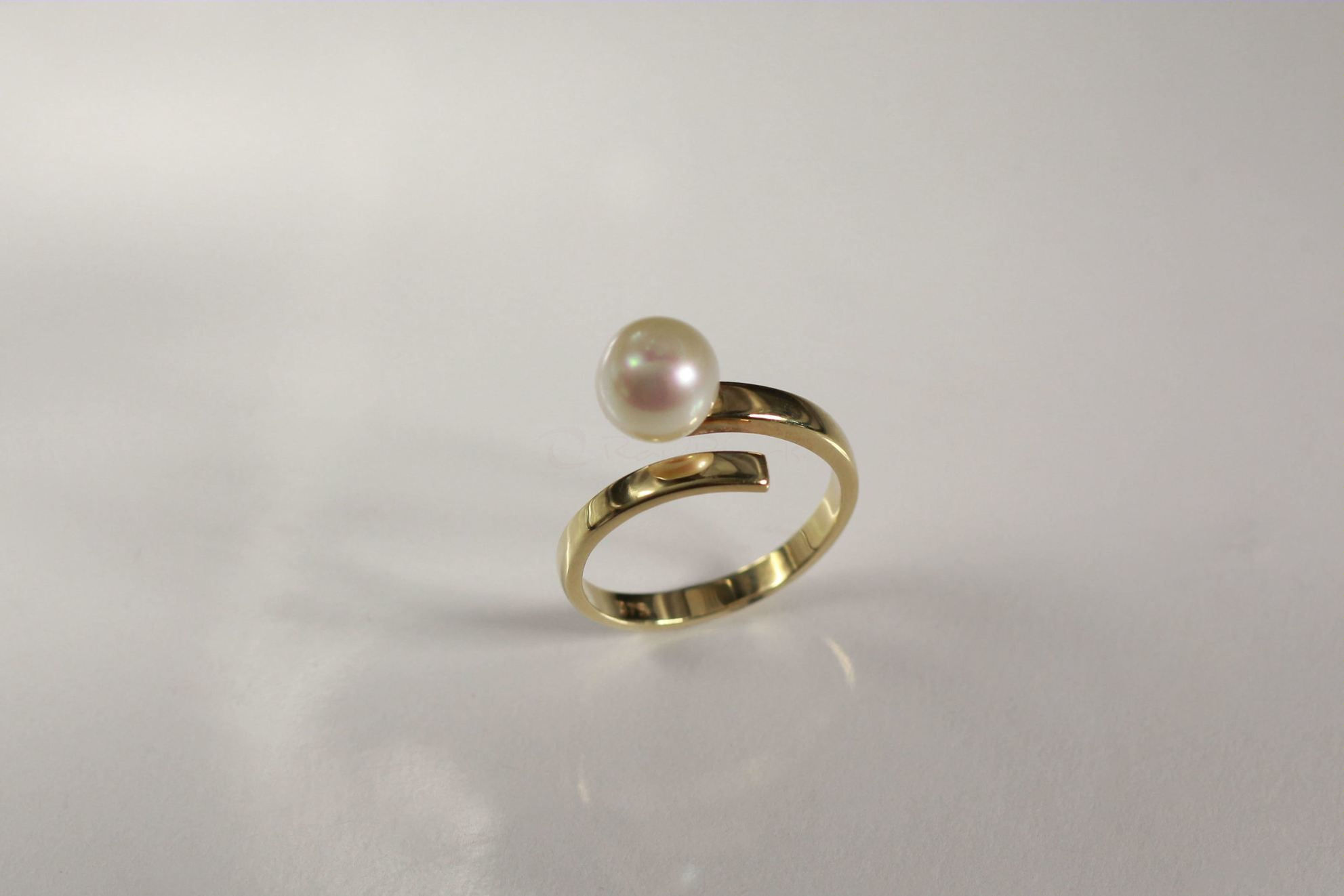 One (1) half drilled Freshwater Cultured Pearl measuring 7.70mm in size and round (RD) in shape with an excellent lustre and clean skin surface. The main body colour of the pearl is cream with pink overtones. The setting is 9ct (375) yellow gold in a 2.30mm wide 1.10mm thick plain flat shank with crossover open ended top and one end post set with an extended Pearl. The ring has a polished finish with a gold hall mark of 375 (9ct) and a total weight of 2.70 grams.