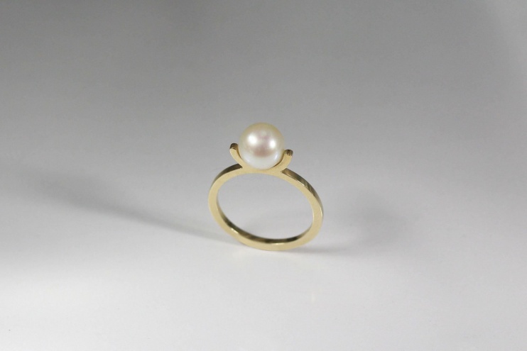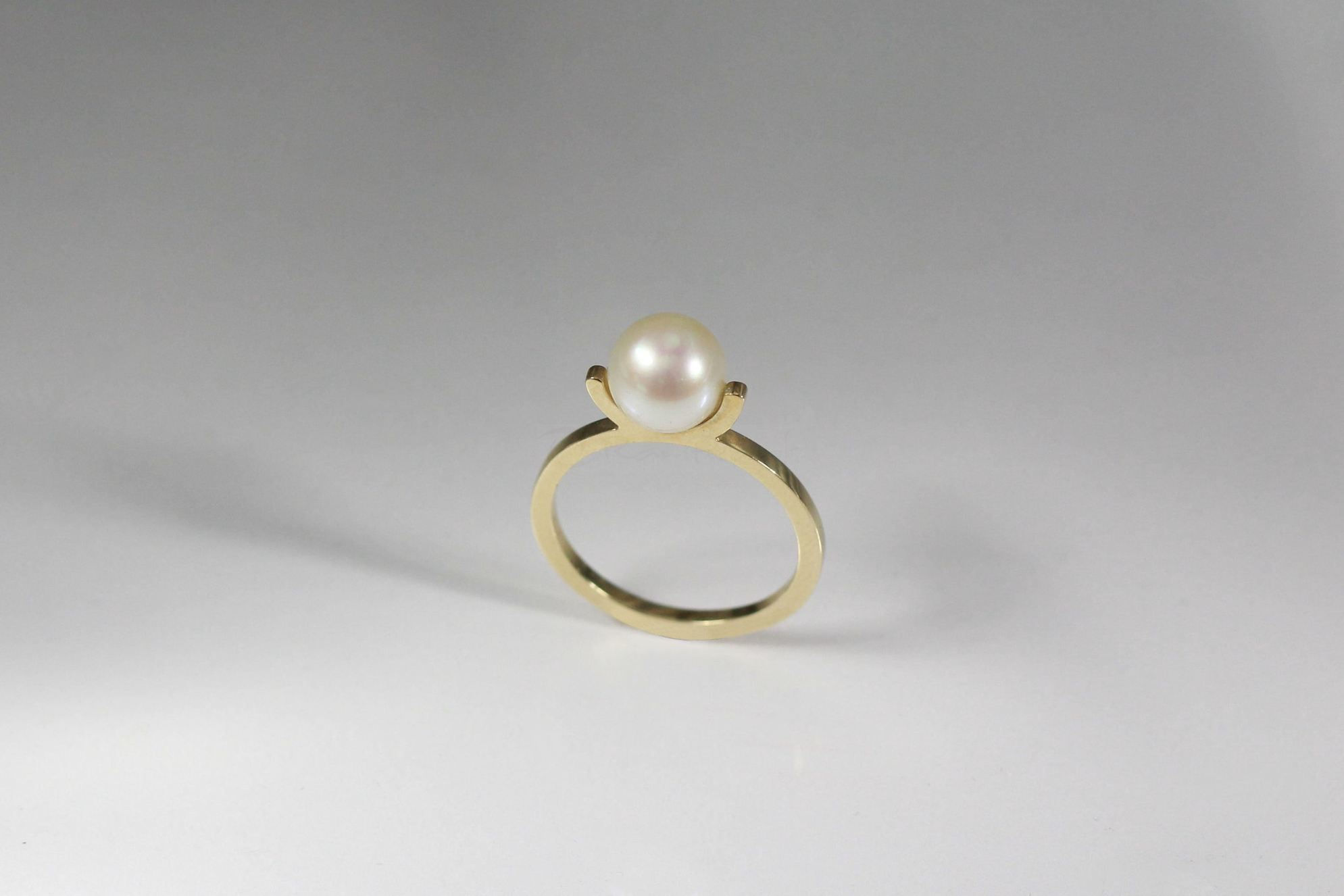 One (1) half drilled Freshwater Cultured Pearl measuring 7.70mm in size and round (RD) in shape with an excellent lustre and clean skin surface. The main body colour of the pearl is cream with pink overtones. The setting is 9ct (375) yellow gold in a 1.50mm wide 1.30mm thick plain flat shank with “U” shape setting supporting the post with Pearl. The ring has a gold hallmark of 375 (9ct) and “Raw Pearls” corporate logo. It has a polished finish with a total weight of 2.30 grams.