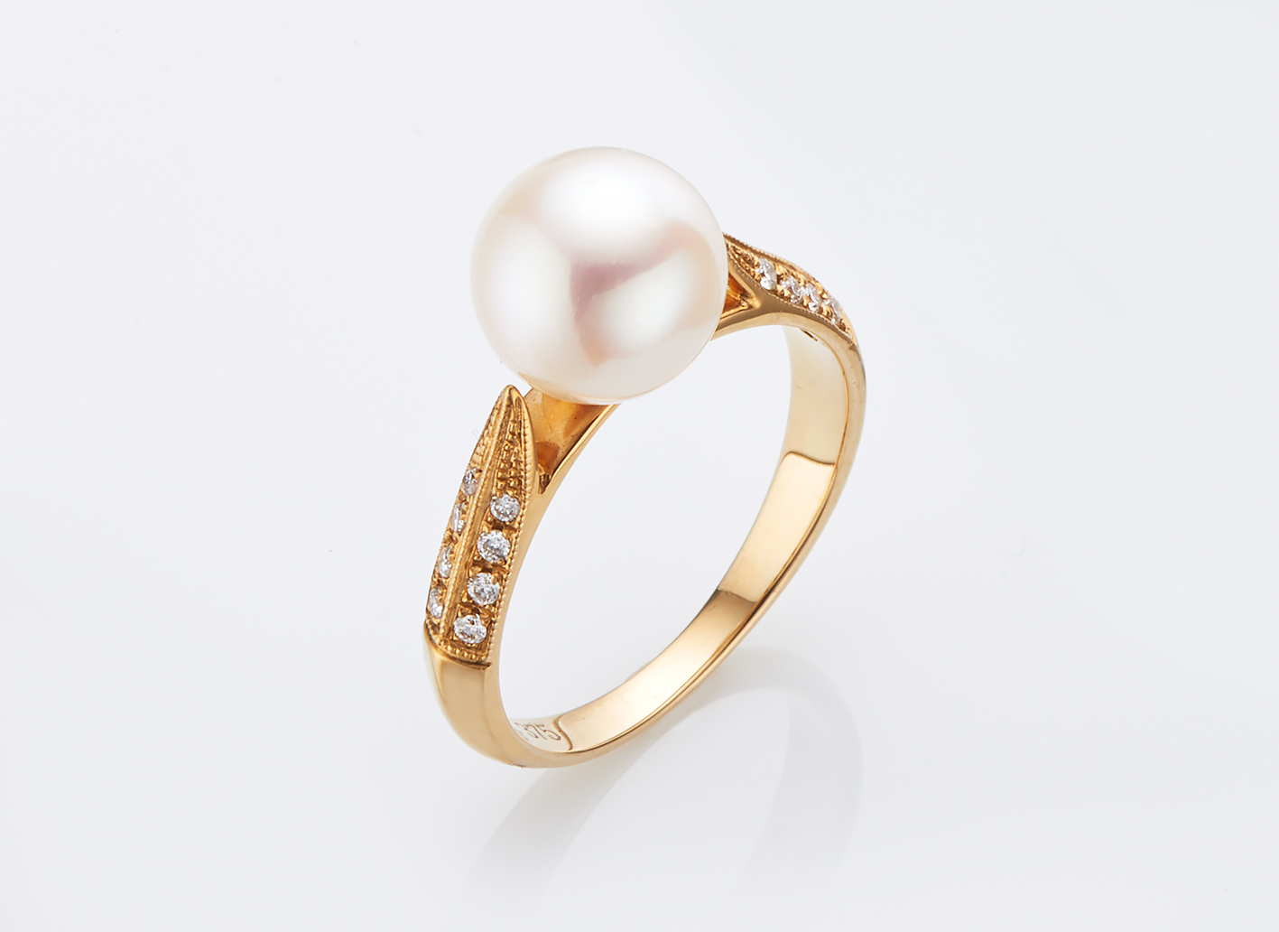 One (1) half drilled Freshwater Cultured Pearl measuring between 8.50mm-9.00mm in size and round (RD) in shape. The main body colour is cream with strong pink overtones excellent lustre and clean skin surface. The setting is 9ct (375) yellow gold with upswept shoulders pave set with round brilliant diamonds (total diamond weight 16= 0.09ct colour G Clarity SI) with central pearl. The ring has a polished finish with a gold hall mark of 375 (9ct) and a total weight of 2.80 grams.