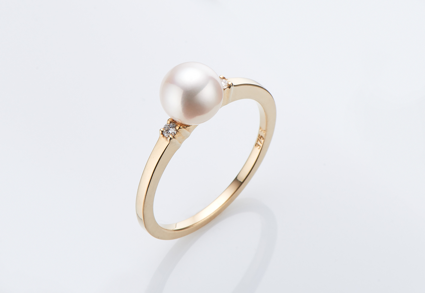 One (1) half drilled Freshwater Cultured Pearl measuring between 6.50mm-7.00mm in size and round (RD) in shape. The main body colour is white with strong pink overtones excellent lustre and clean skin surface. The setting is 9ct (375) yellow gold 1.50mm wide 1.50mm thick plain flat comfort shank with upswept reverse tapered shoulders each with a round brilliant diamond (total diamond weight 2=0.04ct colour G clarity SI) claw set either side of central cup and post set pearl. The ring has a polished finish with a total weight of 2.08 grams.